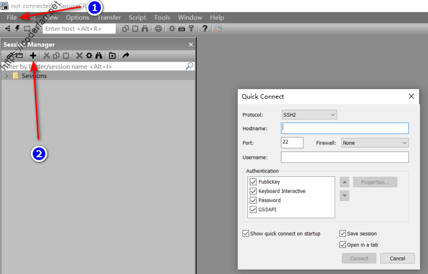 当我们进入SecureCRT后,我们点击File会出现Session Manager,我们点击类似与“+”的符号建立New Session,或者在File菜单下选择Quick Connect也可以进入软件连接页面。