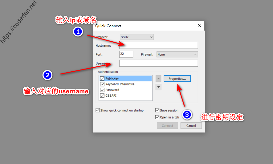 如果我们使用密钥进行登录,在Authentication这里选择选中PublicKey,点击Properties,进入PublicKey的具体设置页面。