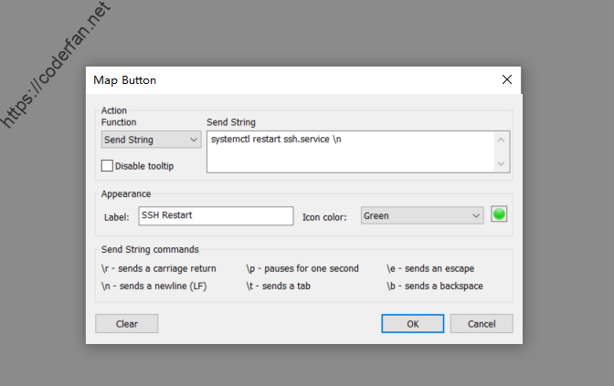 我们通过Label来区别不同的Button,一般发送的内容为string类型,如上图所示,我们这里发送的命令是用于重启ssh服务的命令。在设定好以后,我们点击该Button就可以发送这一串命令。