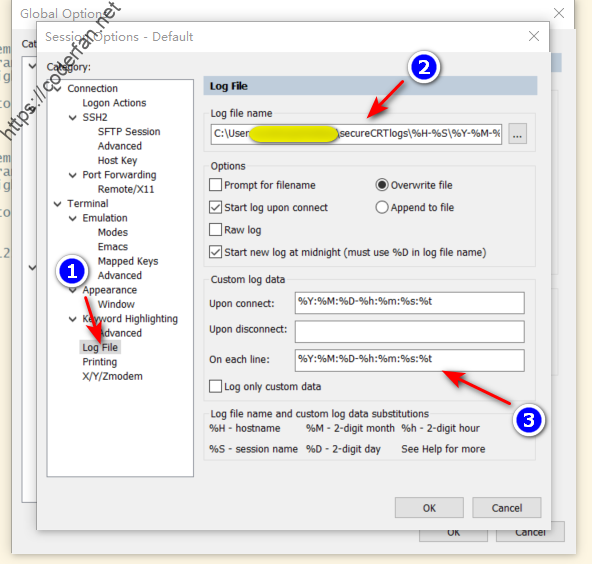 Log file name:这是Log文件的名称设定,我们可以设定按照Host/Session独立成单独的子目录进行日志记录,并以时间来命名,如:C:\Users\xxxxx\Desktop\secureCRTlogs\%H-%S\%Y-%M-%D-%h.log